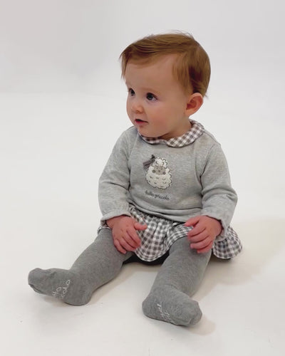 Este conjunto para recién nacido incluye un vestido de interlock gris con detalles en cuadros y una delicada decoración de ovejita en el delantero, que aporta un toque tierno y acogedor. Cuenta con goma en los puños para un ajuste cómodo y una abertura trasera con botones a presión que facilita el cambio de ropa. Los leotardos en color gris complementan el conjunto, ofreciendo suavidad y elasticidad gracias a su composición de algodón, poliamida y elastano. Ideal para mantener a tu bebé cómodo y con estilo en cualquier ocasión.